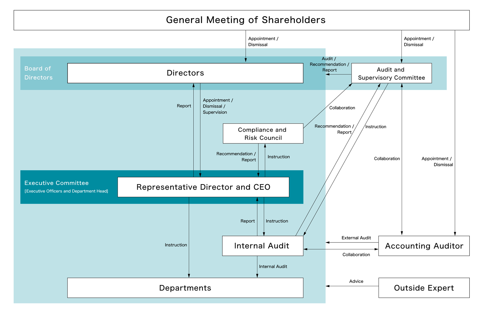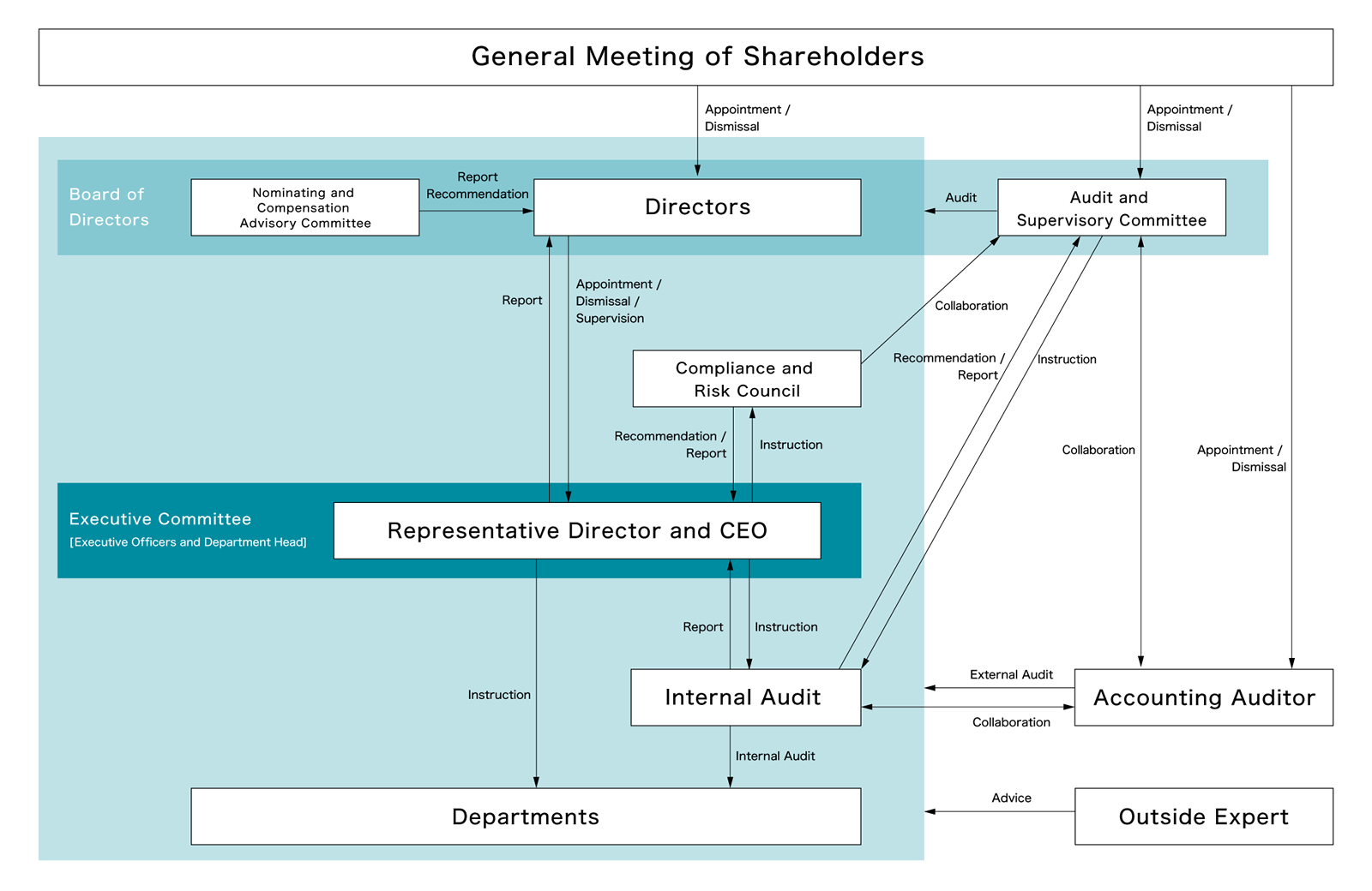 In January 2023, the Company transitioned to a company with Audit and Supervisory Committee structure to strengthen further the management and oversight functions of the Board of Directors, which makes key management decisions and oversees business execution, as well as improve the agility and efficiency of business execution. The Audit and Supervisory Committee (with external directors accounting for the majority of its members) works closely with the Internal Control Department, etc., to oversee from a neutral and independent standpoint whether the Board of Directors is making decisions appropriately and efficiently.