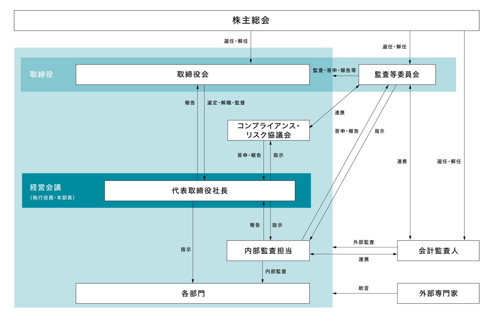 当社は、経営の重要な意思決定及び業務執行の監督を行う取締役会の経営機能及び監督機能の一層の強化、並びに業務執行の機動性・効率性の更なる向上を図るために、2023年1月より監査等委員会設置会社に移行しました。社外取締役が過半数を占める監査等委員会が、内部統制部門等と緊密に連携し、中立・独立の立場から、取締役会による意思決定が適切かつ効率的に行われていることを監督しています。